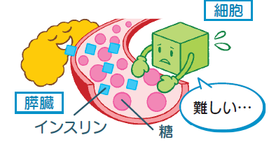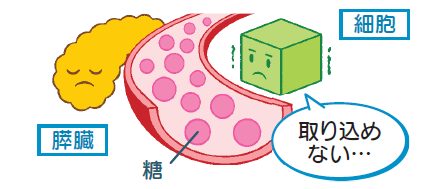 糖は私たちの活動の大切なエネルギー源で、血液中の糖はインスリンの働きによって細胞に取り込まれます。インスリンが十分に働かないと細胞に糖が取り込まれず、高血糖の状態になります。