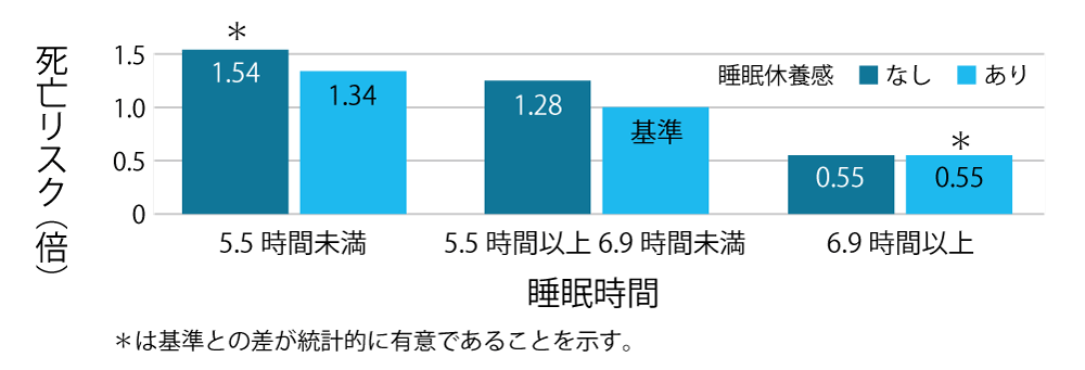 出典:「健康づくりのための睡眠ガイド2023」(Yoshiike T, Utsumi T, Matsui K, Nagao K, Saitoh K, Otsuki R, Aritake-Okada S, Suzuki M, Kuriyama K. Mortality associated with nonrestorative short sleep or nonrestorative long time-in-bed in middle-aged and older adults. Sci Rep 12: 189, 2022. より作成)