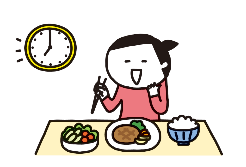 夜遅い時間に摂取したエネルギーは消費されにくく、体脂肪として蓄積されやすくなります。夕食がどうしても遅くなってしまう場合は、夕方早めの時間に主食をおにぎりなどでしっかりとり、帰宅後の夕食は主菜や副菜だけにするのがおすすめです。また、朝昼晩の3食以外の間食などはやめましょう。