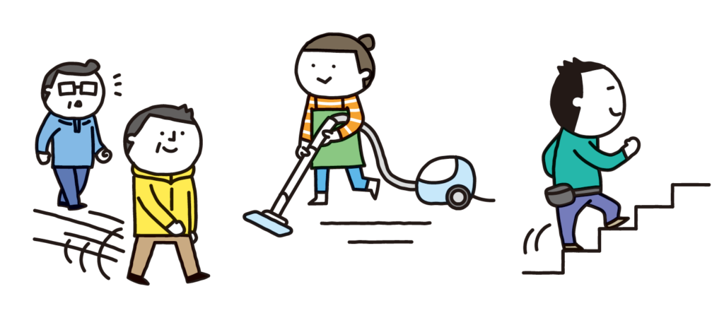歩く距離や時間を増やす、階段を使う、まめに掃除をするなど、普段から体を動かすことを意識して過ごしましょう。歩くときは、同じ年代の同性の人と比較して、自分のほうが速く歩くよう意識すると、より効果的です。