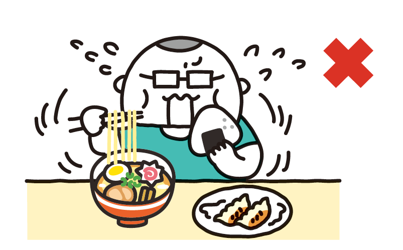 肥満の人はやせている人に比べて食べる速度が速いという報告もあります。「よく噛んで食べる」「会話を楽しみながら食べる」「汁物で流し込むような食べ方をしない」などの工夫で、ゆっくり食べる習慣をつけましょう。