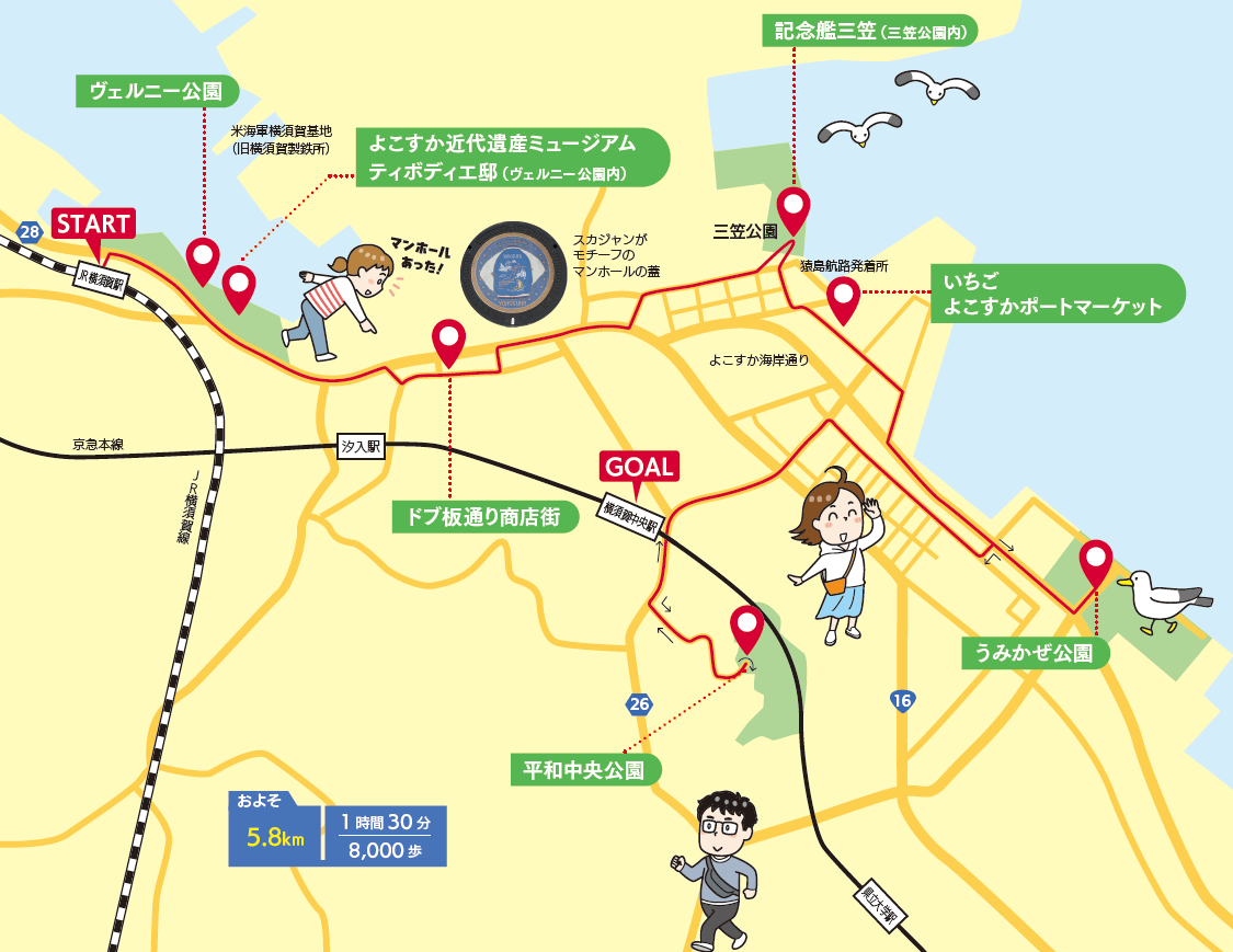 帰路はよこすか海岸通りを戻り、高台にある平和中央公園まで足を運ぶ。東京湾と横須賀市街の展望を楽しんだら、ゴールの横須賀中央駅を目指そう。