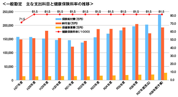 保険給付費は増加傾向が続いており、令和8年度には診療報酬改定等の影響もあって大幅な増加が見込まれます。この状況を踏まえ、令和8年度の経常収支(保険料収入等から保険給付費・納付金・保健事業費等を差し引いた実質収支)は、7億4,567万円の赤字予算となりました。