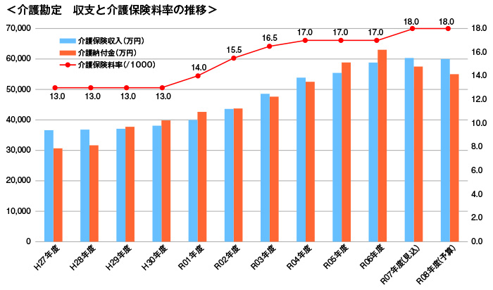 介護勘定は、直近2年間は介護納付金が減少傾向にありますが、高齢化の進捗に伴い再び増加に転じることが懸念されるため、今後の動向を注視してまいります。